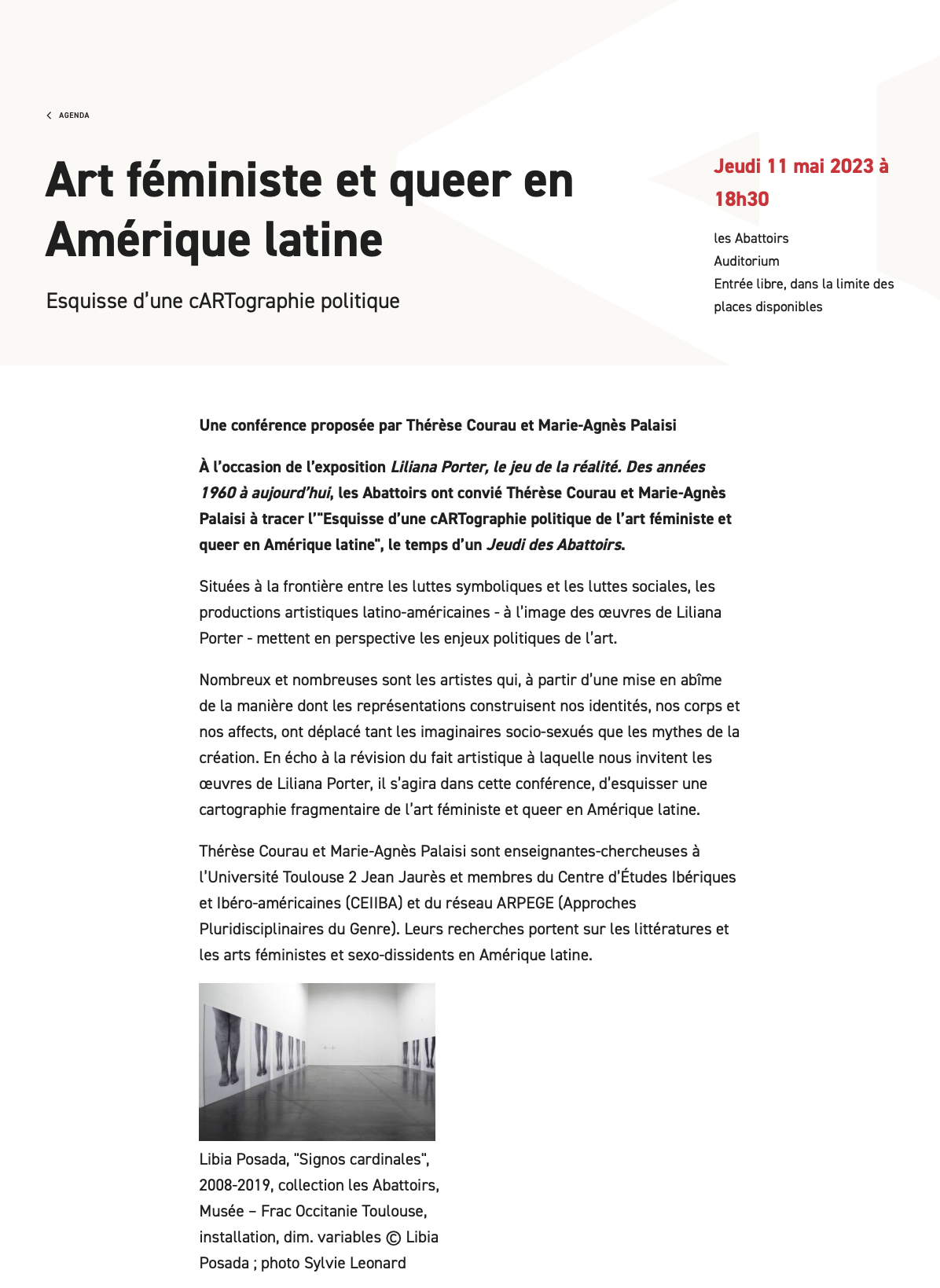 À l’occasion de l’exposition Liliana Porter, le jeu de la réalité. Des années 1960 à aujourd’hui, les Abattoirs ont convié Thérèse Courau et Marie-Agnès Palaisi à tracer l’"Esquisse d’une cARTographie politique de l’art féministe et queer en Amérique latine", le temps d’un Jeudi des Abattoirs.